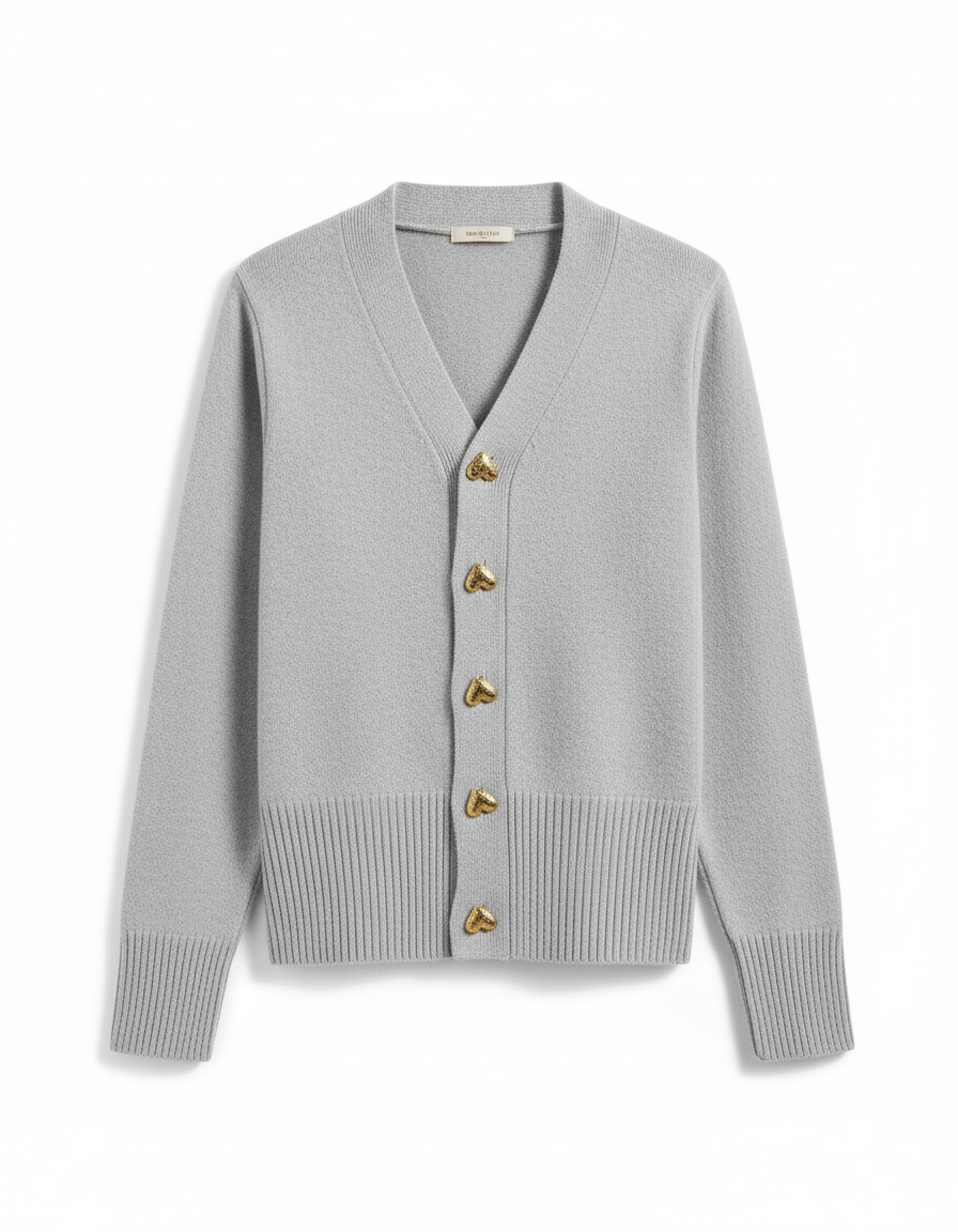 Add a touch of refined charm to your wardrobe with this elegant knit cardigan, combining comfort and sophistication in perfect harmony. Designed with a gentle, soft-touch texture and adorned with heart-shaped buttons, it’s the ideal piece for effortless layering through every season.