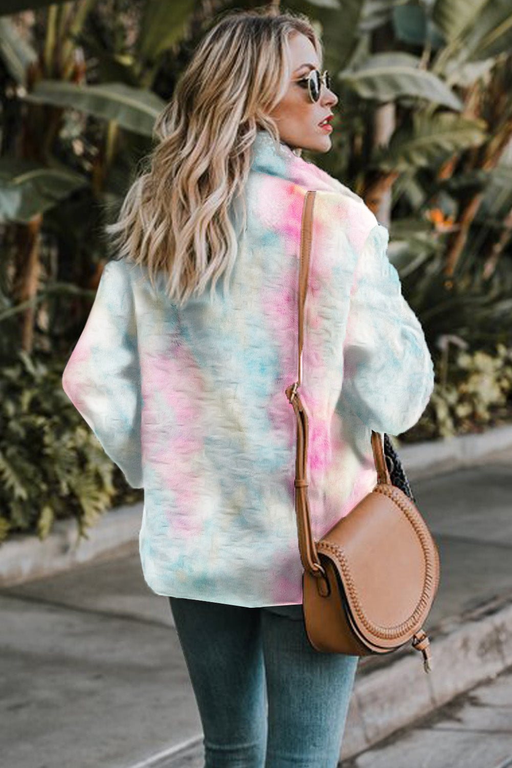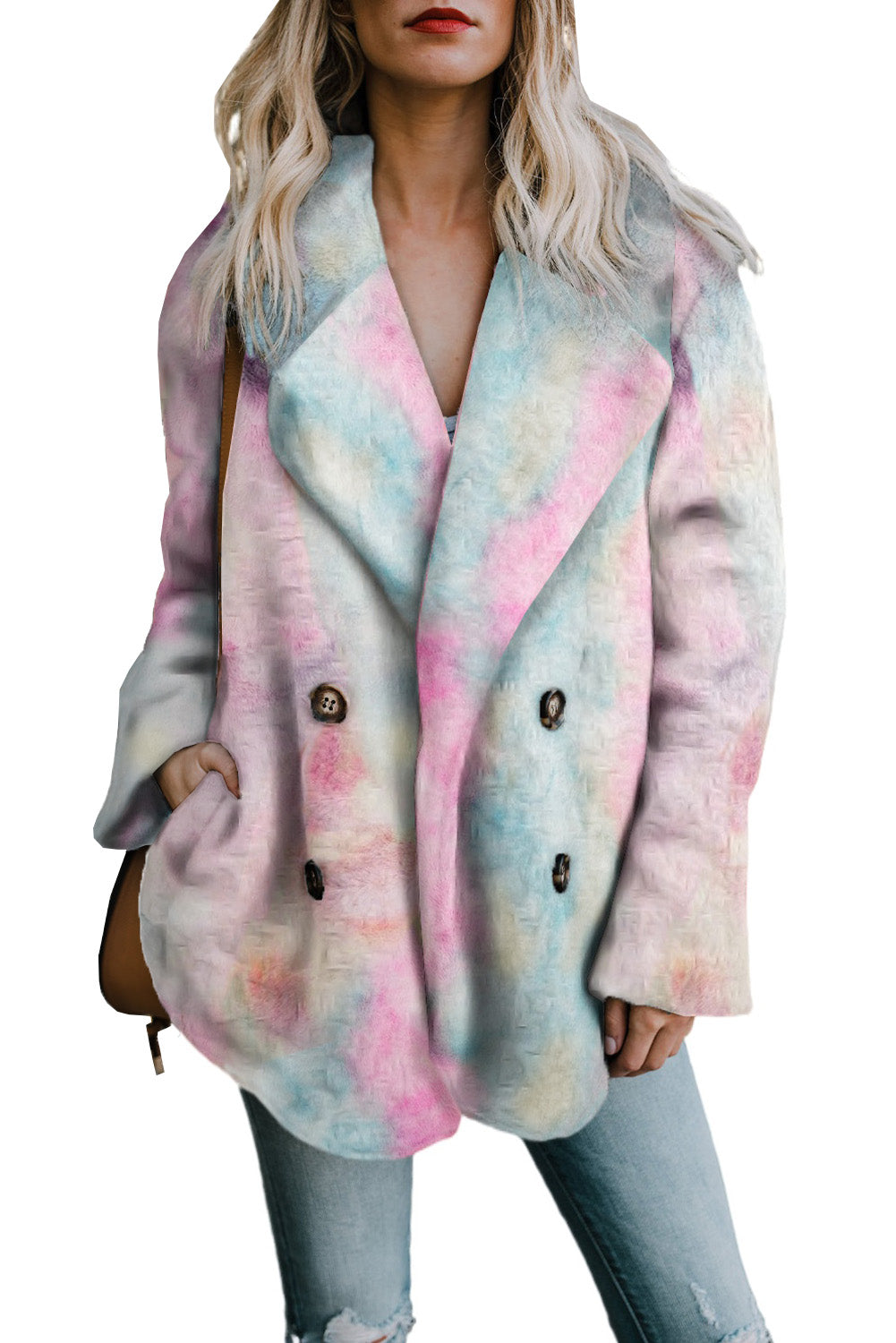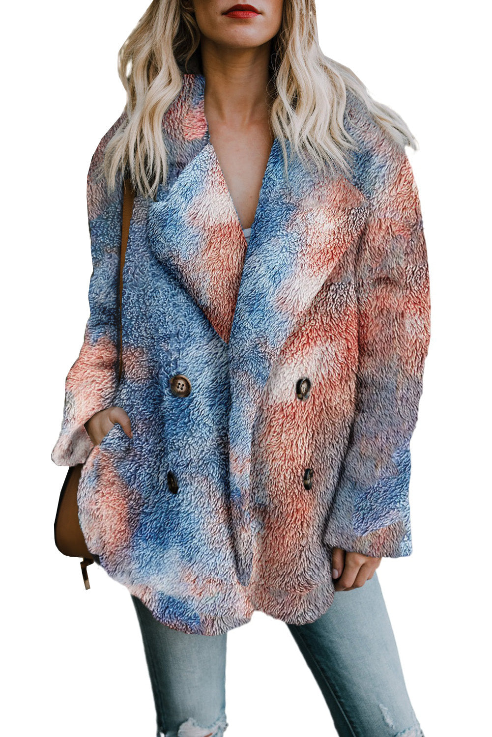 Embrace warmth and style this winter with our Tie Dye Lapel Collar Open Front Fleece Coat. Crafted from premium, skin-friendly fabric, this plush coat offers exceptional comfort and a soft feel. Featuring a trendy tie-dye print, stylish lapel, two convenient side pockets, and luxurious faux fur detailing, this warm and cozy fleece coat is perfect for chilly days. It's versatile for daily wear, school, vacation, work, clubbing, parties, or a stroll down the street. Pair it effortlessly with skinny jeans, leggings, t-shirts, tops, and shirts. Size Chart (CM): S: Bust 106, Shoulder 40.8, Sleeve Length 62, Length 70; M: Bust 111, Shoulder 42, Sleeve Length 63, Length 72; L: Bust 116, Shoulder 43.2, Sleeve Length 64, Length 74; XL: Bust 124, Shoulder 45.4, Sleeve Length 65, Length 76; 2XL: Bust 132, Shoulder 47.6, Sleeve Length 66, Length 78. Size Chart (INCH): S: Bust 41.7, Shoulder 16.1, Sleeve Length 24.4, Length 27.6; M: Bust 43.7, Shoulder 16.5, Sleeve Length 24.8, Length 28.3; L: Bust 45.7, Shoulder 17.0, Sleeve Length 25.2, Length 29.1; XL: Bust 48.8, Shoulder 17.9, Sleeve Length 25.6, Length 29.9; 2XL: Bust 52.0, Shoulder 18.7, Sleeve Length 26.0, Length 30.7. Elasticity: Medium (one-sided stretched). Important Notes: 1. There may be 1-2 cm (0.4-0.8 inch) deviation in measurements. The size chart is for reference; actual garment measurements may vary. 2. Color may be lighter or darker due to different PC displays. 3. Care Instructions: Hand wash in 30-degree water, hang to dry in shade, do not bleach. 4. Slight differences in detail and pattern may occur.